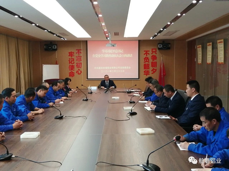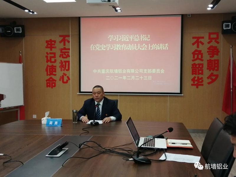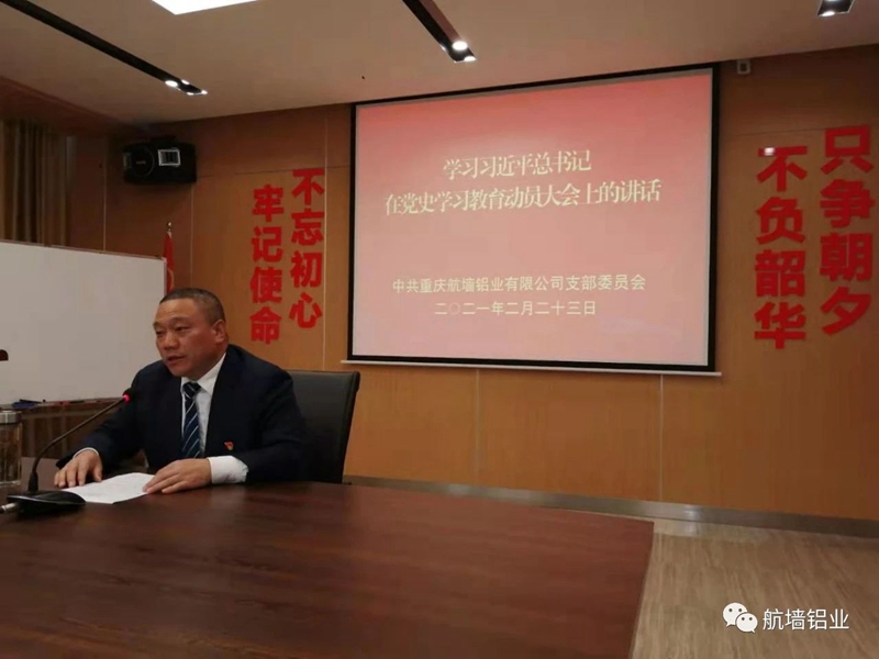 2021年2月23日,中共重慶航墻鋁業有限公司黨支部組織召開黨員大會,學習《習近平在黨史學習教育動員大會上的講話》,部署開展“學黨史”教育活動,會議邀請公司所有退伍軍人和入黨積極分子參加,由公司黨支部書記藺勇主持。