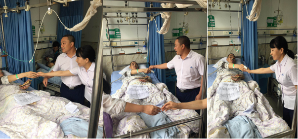11號下午,藺董事長和公司工會主席毛友銀冒著大雨親自將工會的5000元捐款和工友們的13705元捐款送到涪陵中心醫院張遠全手里,用作他即將進行的第二次手術費用(因為他兩腿骨折加之肺血栓、腸穿孔,一次只能對一條腿實施手術,馬上要對第二條腿進行手術)。