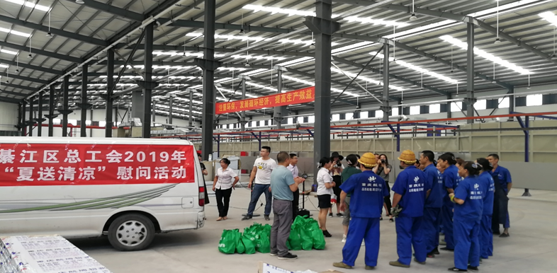8月13日14:30時左右,一輛標有“綦江區總工會2019年‘夏送清涼’的車”緩緩駛進航墻鋁業生產車間,綦江區人大副主任、綦江區總工會主席劉洪兵,綦江區總工會黨組書記、副主席梁曉春,副主席劉世平,副主席朱澤東等領導,頂烈熱、冒酷暑來到車間慰問生產一線職工。