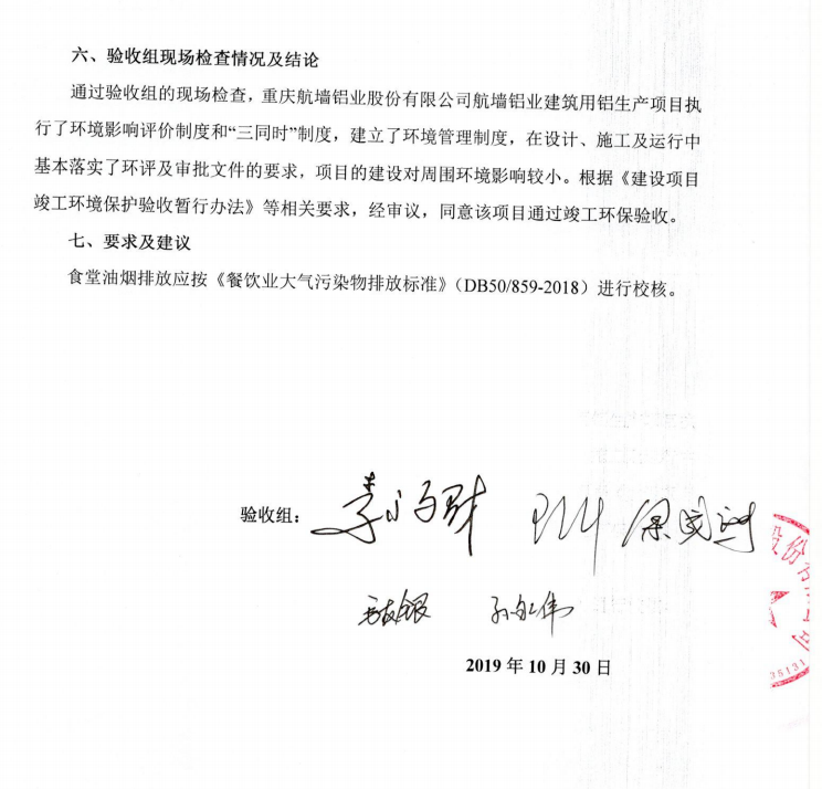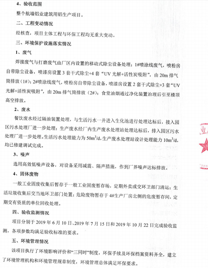 時 間:2019 年 10 月航墻鋁業(yè)建筑用鋁生產(chǎn)項目竣工環(huán)境保護驗收監(jiān)測報告